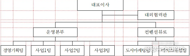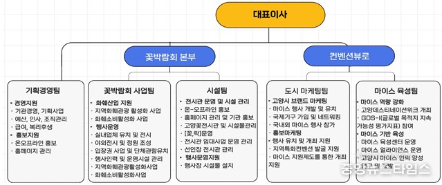 기존 통합 계획시 조직의 경우 ‘꽃박람회본부’와 ‘컨센션뷰로’로 구분되어 있고 기획경영팀은 별도로 분리되어 있었지만 현재 조직구성은 기획경영팀이 경영기획팀으로 명칭이 변경되어 운영본부에 속해져 운영되고 있었던 것이다.