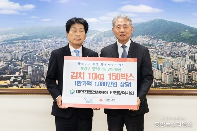(중앙뉴스타임스 = 방재영 기자) 인천 계양구는 24일 대한전문건설협회 인천광역시회(회장 조흥수)가 취약계층의 겨울철 식생활 지원을 위해 김치(10kg) 150박스(환가액 1080만 원 상당)를 기탁했다고 밝혔다.