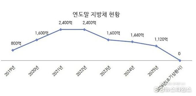 해당 지방채(2400억원)는 △2023년 1600억원 △2024년 1440억원 △2025년 1120억원으로 점차 줄었다.