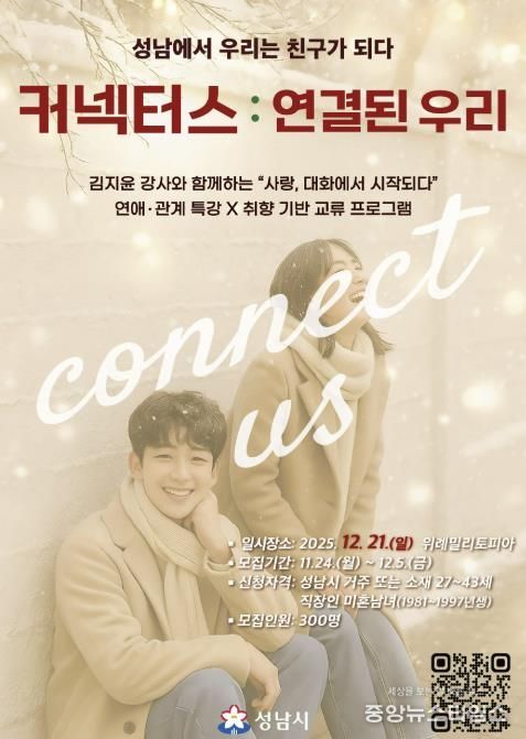 (중앙뉴스타임스 = 방재영 기자) 성남시는 새로운 친구를 만들 수 있는 청년 교류 행사 ‘커넥터스(Connect-us) 연결된 우리’ 참가 희망자 300명을 오는 12월 5일까지 모집한다고 27일 밝혔다.