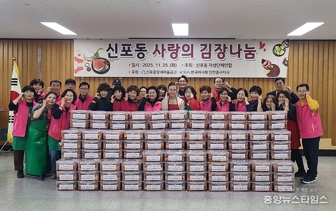 (중앙뉴스타임스 = 방재영 기자) 인천 중구 신포동 자생단체연합은 지난 25일 관내 저소득 취약계층 100가구를 위해 ‘사랑의 김장 김치 나눔’ 행사를 성황리에 진행했다고 밝혔다.