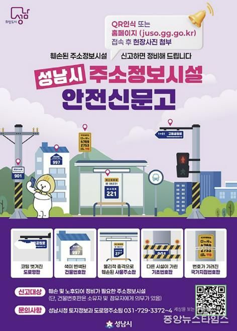 (중앙뉴스타임스 = 방재영 기자) 성남시는 도로명주소 안내시설물의 체계적 관리와 시민 안전 확보를 위해 ‘성남시 주소정보시설 안전신문고’를 상시 운영한다고 4일 밝혔다.