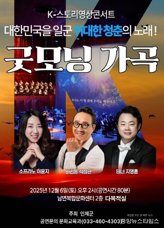 (중앙뉴스타임스 = 방재영 기자) 인제군이 오는 12월 6일 오후 2시 남면복합문화센터에서 연말 음악회 ‘굿모닝 가곡’을 개최한다.