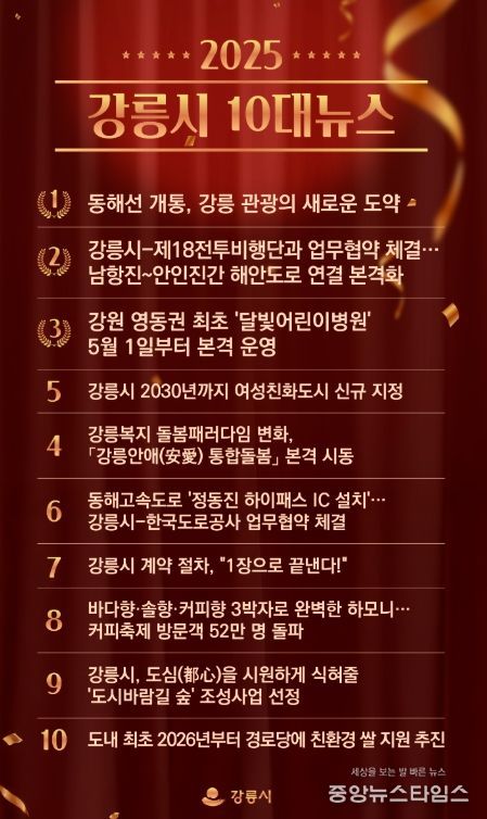 강릉시 관계자는 “올 한 해 강릉의 변화를 이끈 10대 뉴스는 공직자와 시민이 함께 만들어 낸 성과”라며, “이번 결과를 토대로 행정의 사각지대를 더욱 세심하게 살피고, 시민 누구나 일상에서 변화를 체감할 수 있도록 ‘더 큰 강릉, 더 따뜻한 강릉’을 향한 정책을 한층 속도감 있게 추진하겠다.”고 말했다.