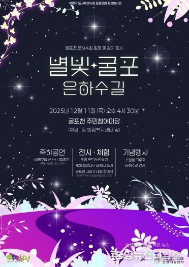 한편 ‘별빛굴포 은하수길’ 행사는 가족 단위 주민부터 남녀노소 누구나 자유롭게 참여할 수 있는 열린 행사로, 굴포천을 중심으로 이웃과 함께 어울리며 연말의 정취를 나누는 시간이 될 전망이다.
