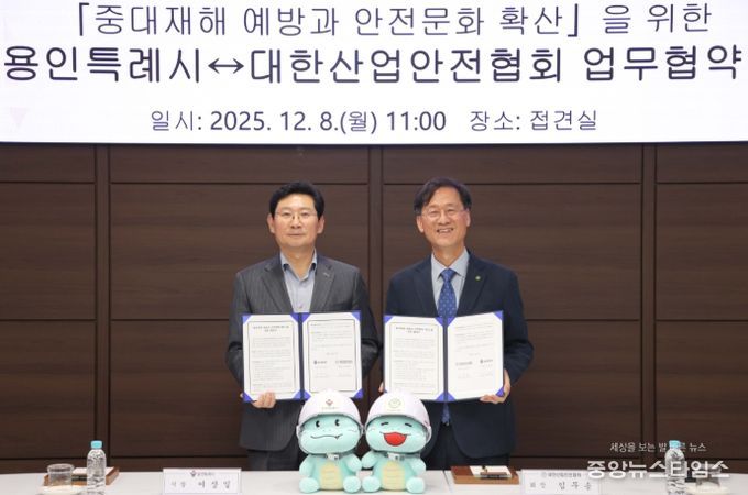 (중앙뉴스타임스 = 방재영 기자) 용인특례시는 8일 시청 4층 접견실에서 대한산업안전협회와 ‘중대재해 예방과 안전문화 확산을 위한 업무협약’을 맺었다.