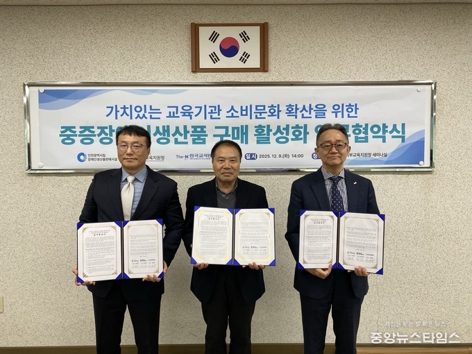 (중앙뉴스타임스 = 방재영 기자) 인천서부교육지원청은 9일 인천시립장애인생산품판매시설, 한국교직원공제회(S2B)와 ‘중증장애인생산품 구매 활성화 업무협약’을 체결했다.