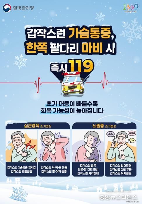 (중앙뉴스타임스 = 방재영 기자) 평택시 송탄보건소는 아침저녁 쌀쌀한 날씨로 인해 기온이 낮아지는 겨울철, 심근경색과 협심증 같은 급성 심장질환과 뇌졸중에 대한 세심한 주의를 당부했다.