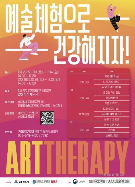 (중앙뉴스타임스 = 방재영 기자) 삼척시는 가톨릭관동대학교 RISE 사업단과 협력하여 지역 자연자원을 활용한 ‘융합예술치유 프로그램’을 12월 도계고등학교 체육관과 삼척체육관에서 개최한다고 10일 밝혔다.
