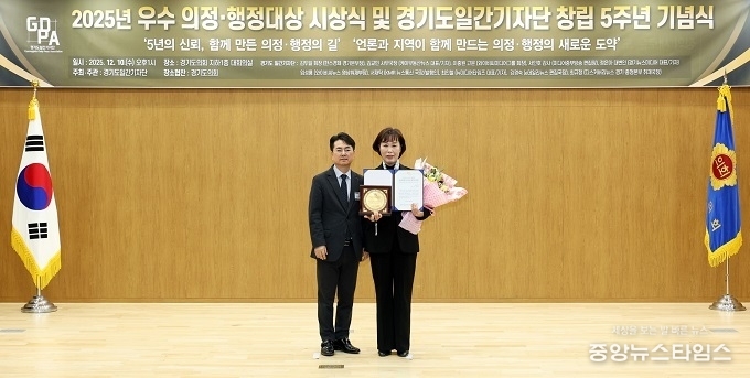 (중앙뉴스타임스 = 방재영 기자) 경기도의회 국민의힘 정책수석이자 경제노동위원회 소속 이채영 의원(국민의힘, 비례)은 10일 경기도의회 대회의실에서 경기도일간기자단이 주최한 2025년 우수 의정·행정대상 시상식에서 ‘경기도의회 우수의정 그랜드마스터상’을 수상했다.