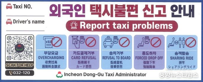 (중앙뉴스타임스 = 방재영 기자) 인천 동구는 외국인 관광객을 대상으로 한 불법 택시 영업을 근절하고 이용 편의를 높이기 위해 ‘불편 신고 QR스티커’를 택시에 부착한다고 12일 밝혔다.