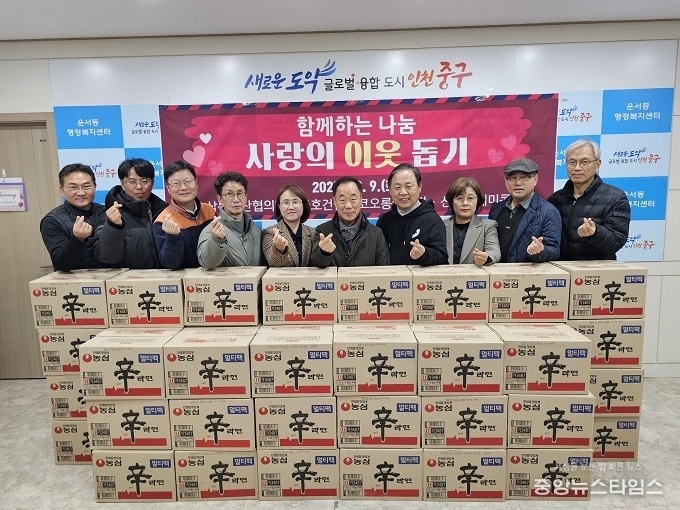 (중앙뉴스타임스 = 방재영 기자) 인천 중구 운서동 행정복지센터는 지난 9일 ‘삼목석산협의회(회장 박상우)’에서 ‘금호건설’, ‘코오롱 건설회사’, ‘신공항레미콘’ 등 건설사 등과 함께 ‘함께하는 나눔 사랑의 이웃돕기’ 행사를 통해 170만 원 상당의 라면을 기탁했다고 밝혔다.