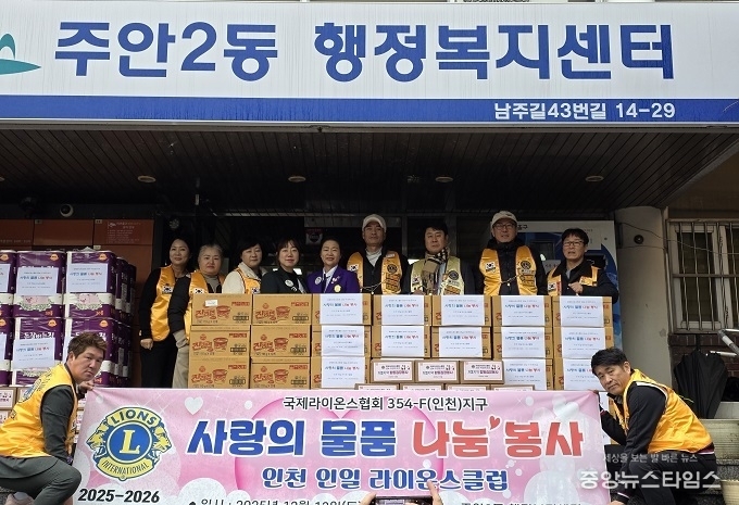 (중앙뉴스타임스 = 방재영 기자) 인천 미추홀구 주안2동(동장 최미희)은 지난 13일 인일라이온스클럽(회장 장정갑)으로부터 200만 원 상당의 생필품과 김치를 전달받았다.