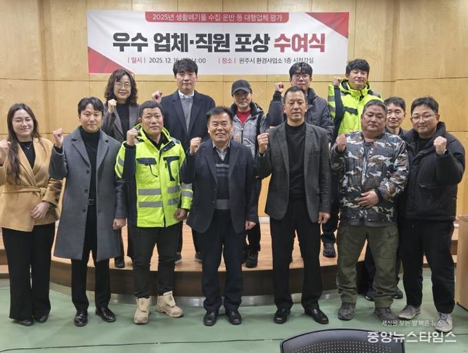 (중앙뉴스타임스 = 방재영 기자) 원주시는 12월 16일 '2025년 생활폐기물 수집ㆍ운반 대행업체 평가결과'에 따른 우수등급 업체 및 소속 직원을 대상으로 원주시장 상장 및 표창장을 수여한다.