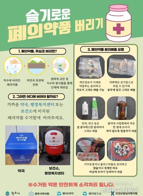 (중앙뉴스타임스 = 방재영 기자) 원주시는 가정에서 배출되는 유통기한 지난 폐의약품을 안전하게 처리하기 위하여 올바른 분리배출 방법 홍보에 나섰다.