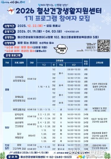 센터는 이 성과를 바탕으로 오는 22일부터 선착순으로 ‘2026년 건강생활 프로그램’ 참가자를 모집한다. 신청은 모집 마감 시까지 방문 또는 광명이(e)지 누리집에서 가능하다.