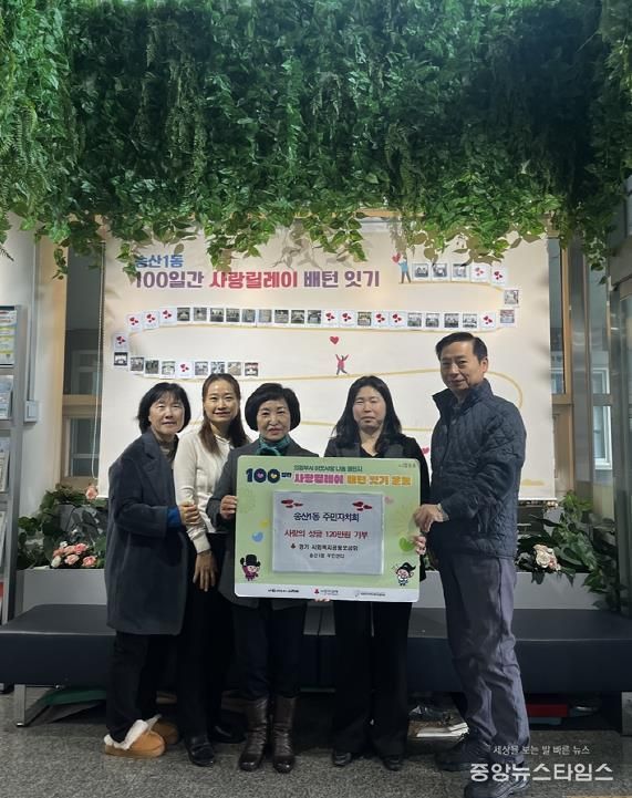 (중앙뉴스타임스 = 방재영 기자) 의정부시 송산1동주민센터는 지난 11일 송산1동 주민자치회가 성금 120만 원을 기탁하며 ‘100일간 사랑릴레이 배턴 잇기’에 동참했다고 밝혔다.
