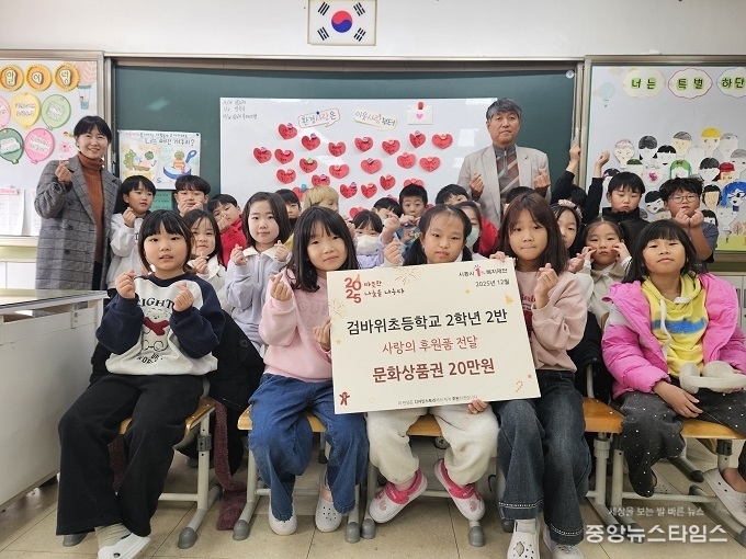 (중앙뉴스타임스 = 방재영 기자) 검바위초등학교(교장 윤현) 2학년 2반은 지난 12일 사랑의 문화상품권 20만원을 시흥시1%복지재단에 기부하는 전달식을 진행했다.