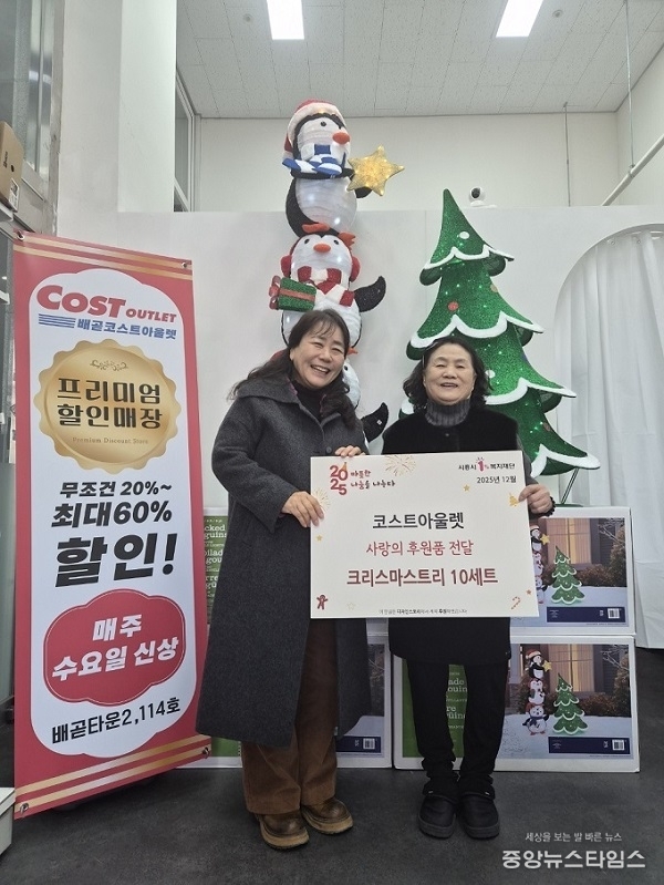 (중앙뉴스타임스 = 방재영 기자) 코스트아울렛(대표 김순여)은 지난 17일 LED 크리스마스트리 10세트를 시흥시1%복지재단에 기부하는 전달식을 진행했다.