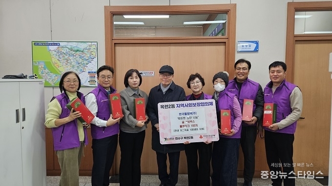 (중앙뉴스타임스 = 방재영 기자) 인천 연수구 옥련2동 지역사회보장협의체(위원장 김영미·박인규)는 지난 18일 성탄절을 앞두고 한국엘레텍(주)(대표 김영일)으로부터 귤 100상자와 롤케이크 100개를 전달받았다.