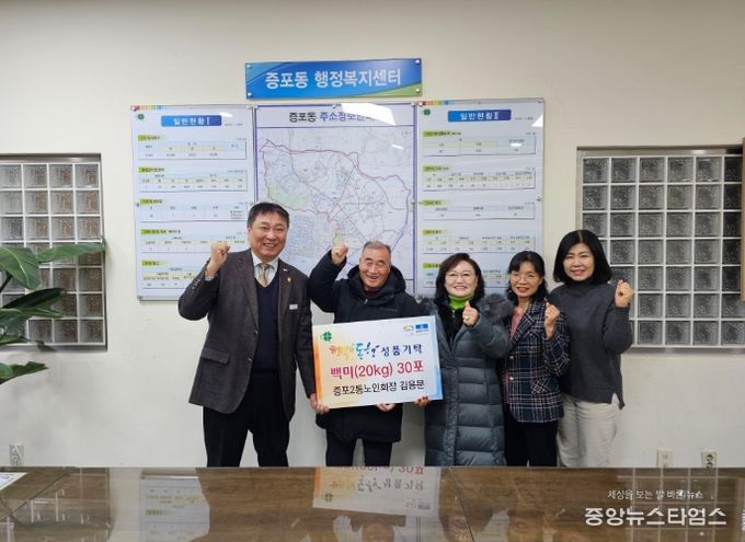 (중앙뉴스타임스 = 방재영 기자) 이천시 증포동은 지난 12월 19일 증포동행정복지센터에서 증포2통 노인회 김용문 회장이 관내 취약계층을 위해 백미(20kg) 30포를 기탁했다고 밝혔다.