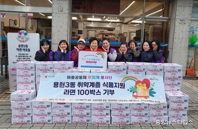 (중앙뉴스타임스 = 방재영 기자) 인천 미추홀구 용현3동(동장 신상일)은 19일 마을 공동체 무지개봉사단(모임 리더 김지안)으로부터 지역사회 나눔 실천의 일환으로 라면 100상자를 전달받았다.