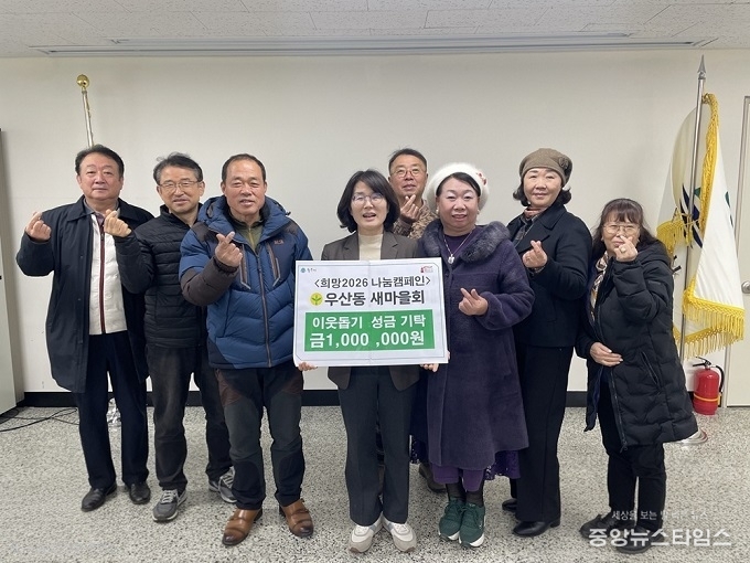 (중앙뉴스타임스 = 방재영 기자) 원주시 우산동새마을회(지도자회장 김영춘, 부녀회장 이가연)는 지난 17일 우산동 행정복지센터를 방문해 희망2026 나눔캠페인 이웃돕기 성금 100만 원을 기탁하며 따뜻한 이웃사랑에 동참했다.