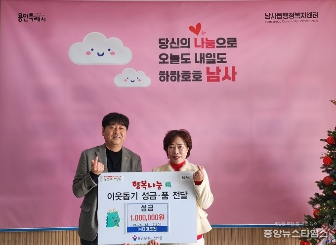 17일 ㈜다해토건은 처인구 남사읍 행정복지센터에 이웃돕기 성금 100만원을 기탁했다. ㈜다해토건 측은 지역사회와 상생하고, 따뜻한 나눔의 가치를 실현하기 위해 성금을 전달했다고 밝혔다.