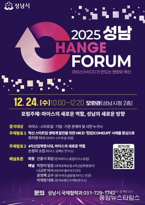 성남시 관계자는 “2025 성남 체인지 포럼은 마이스(MICE)가 산업 간 협력과 생태계 확장을 촉진하며 성남의 변화를 제안하는 첫 행사”라며 “성남의 특화 산업과 도시 전략에 연계한 차별화된 마이스 콘텐츠를 지속적으로 만들어가겠다”고 밝혔다.