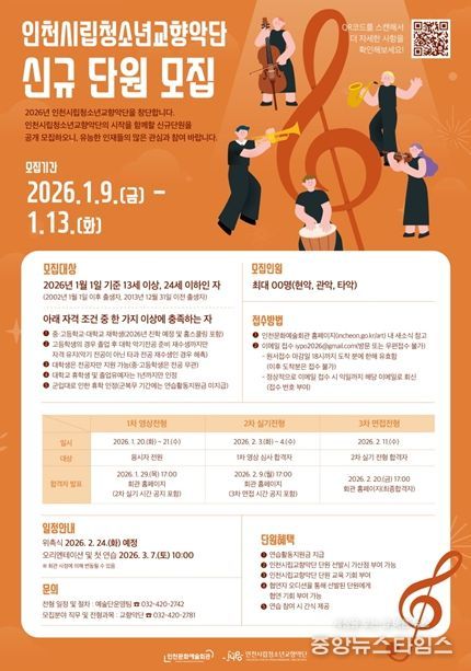 (중앙뉴스타임스 = 방재영 기자) 인천광역시 문화예술회관이 2026년 창단 예정인 인천시립청소년교향악단에서 활동할 신규 단원을 공개 모집한다.