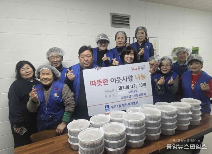 정연직 우만1동 바르게살기운동위원회 위원장은 “회원들이 정성껏 준비한 고기 반찬이 추운 날씨에 따뜻한 도움이 되길 바란다”며 “앞으로도 지속적인 봉사활동을 통해 지역사회 나눔 활동에 힘쓰겠다”고 말했다.