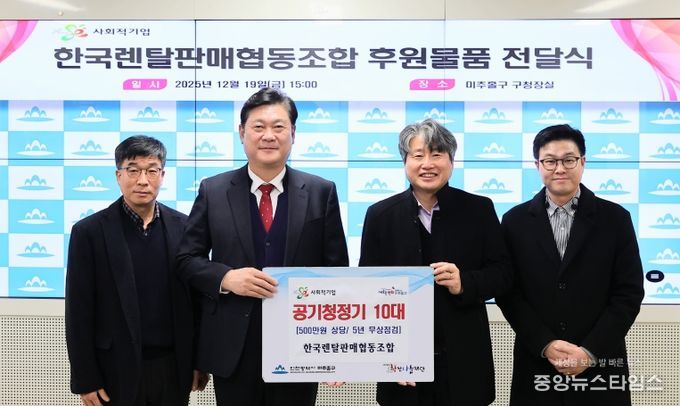 (중앙뉴스타임스 = 방재영 기자) 인천 미추홀구는 지난 19일 사회적기업 한국렌탈판매협동조합(대표 정영이)으로부터 공기청정기 10대를 전달받았다.