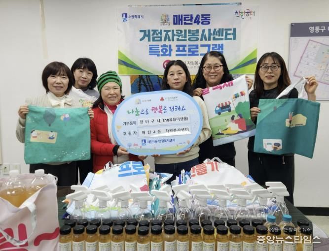 (중앙뉴스타임스 = 방재영 기자) 수원시 매탄4동 자원봉사캠프 코치와 봉사회원들은 지난 12월 19일, 지역 상권 활성화와 마을 공동체 활성화를 위해 회원들이 직접 만든 장바구니와 EM(유용 미생물)을 매탄4동 행정복지센터에 전달했다.