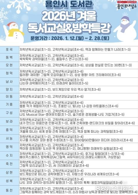 (중앙뉴스타임스 = 방재영 기자) 용인특례시는 내년 1월 12일부터 2월 28일까지 도서관에서 겨울 독서 교실과 방학 특강을 운영한다고 밝혔다.