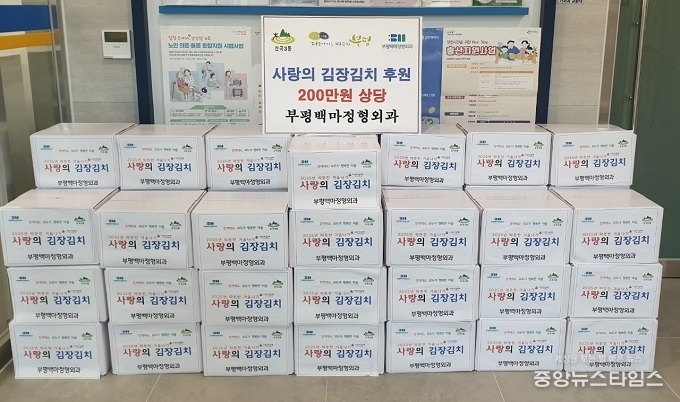 (중앙뉴스타임스 = 방재영 기자) 인천 부평구 산곡3동은 지난 22일 부평백마정형외과로부터 사랑의 김장김치 500kg 기부받았다고 밝혔다.