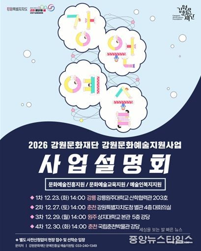 (중앙뉴스타임스 = 방재영 기자) 강원문화재단은 2026년 강원문화예술지원사업의 주요 내용과 변경 사항을 도내 예술인에게 종합적으로 안내하기 위해 ‘2026년 강원문화예술지원사업 통합 설명회’를 개최한다고 25일 밝혔다.