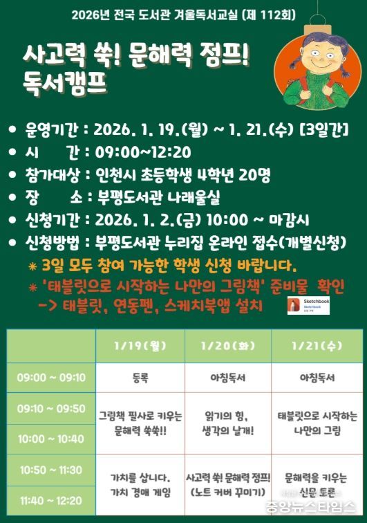 (중앙뉴스타임스 = 방재영 기자) 인천시교육청부평도서관은 2026년 1월 19일부터 21일까지 초등학교 4학년 20명을 대상으로 겨울독서교실 ‘사고력 쑥! 문해력 점프! 독서캠프’를 운영한다고 26일 밝혔다.