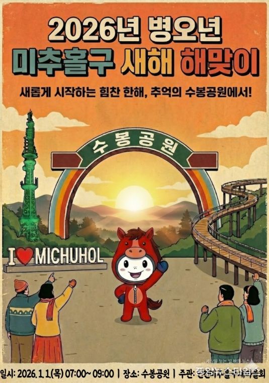 (중앙뉴스타임스 = 방재영 기자) 인천 미추홀구새마을회는 오는 2026년 1월 1일 오전 7시부터 9시까지 수봉공원에서 ‘2026 병오년(丙午年) 새해 해맞이 행사’를 개최한다.