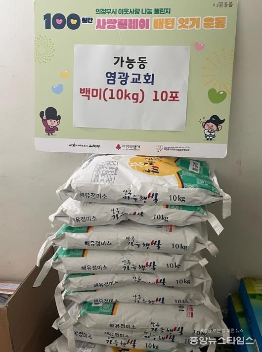 (중앙뉴스타임스 = 방재영 기자) 의정부시 가능동주민센터는 12월 26일 의정부 염광교회가 연말을 맞아 백미 10포(10kg 단위)를 기탁하며 ‘100일간 사랑릴레이 배턴 잇기’에 동참했다고 밝혔다.