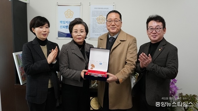 (중앙뉴스타임스 = 방재영 기자) 수원시의회 김미경 의원(더불어민주당, 매교·매산·고등·화서1·2)이 31일 의원 연구실에서 가톨릭대학교 성빈센트병원으로부터 감사패를 수여받았다.