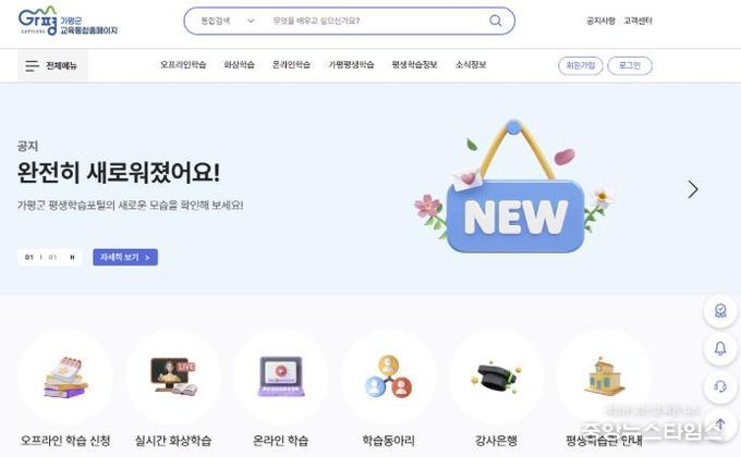 (중앙뉴스타임스 = 방재영 기자) 가평군이 올해부터 군민 모두가 함께 배우고 성장하는 평생학습도시 조성을 목표로 평생학습 홈페이지를 전면 개편해 새롭게 운영한다고 2일 밝혔다. 온라인 기반 학습 환경을 강화하고 교육 참여 기회를 확대하기 위한 조치다.