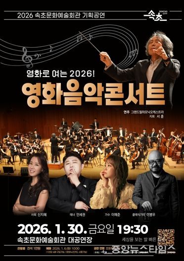 (중앙뉴스타임스 = 방재영 기자) 속초시가 2026년 새해를 맞아 오는 30일 오후 7시 30분, 속초문화예술회관 대공연장에서 ‘영화로 여는 2026! 영화음악콘서트’를 개최한다고 4일 밝혔다.