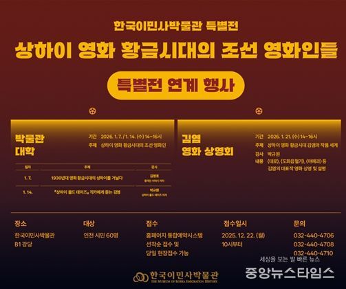 (중앙뉴스타임스 = 방재영 기자) 인천시시립박물관 분관 한국이민사박물관은 특별전 '상하이 영화 황금시대의 조선 영화인들'과 연계해 '중국인 이야기'의 저자 김명호 작가를 초청한 특강을 개최한다고 5일 밝혔다.