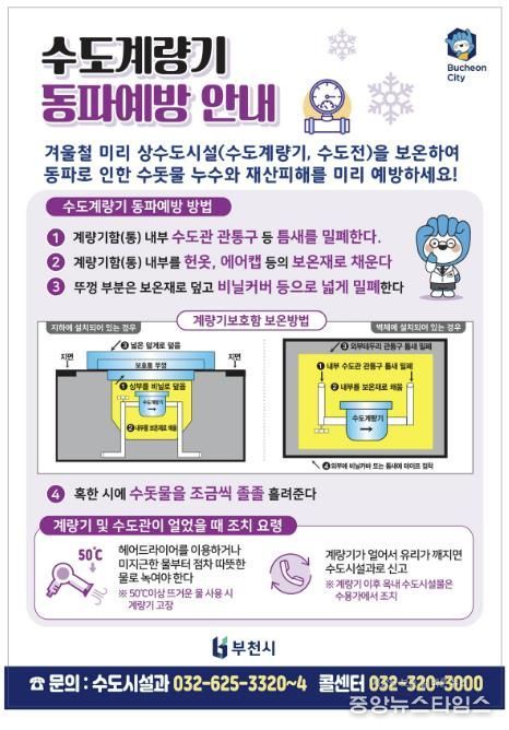 (중앙뉴스타임스 = 방재영 기자) 부천시는 기온이 큰 폭으로 떨어지는 겨울철을 맞아 수도계량기 동파 사고에 선제적으로 대응하기 위해 내년 2월까지 ‘동절기 수도계량기 동파 예방대책’을 마련해 추진 중이다. 이번 대책은 한파에 따른 수도시설 피해를 줄이고 시민 불편을 최소화하려는 조치다.