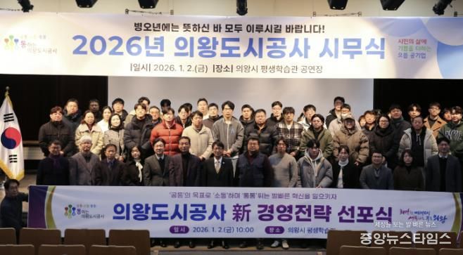 (중앙뉴스타임스 = 방재영 기자) 의왕도시공사는 지난 2일 평생학습관 공연장에서 열린 시무식에서 ‘신경영전략 선포식’을 개최하고, 급변하는 경영환경에 대응하기 위한 새로운 전략 방향과 실행 과제를 공식 발표했다.