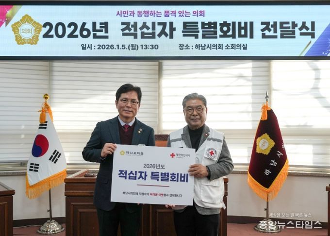 (중앙뉴스타임스 = 방재영 기자) 하남시의회는 5일 오후 시의회에서 ‘2026년 대한적십자사 특별회비 전달식’을 진행했다.