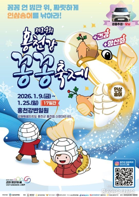(중앙뉴스타임스 = 방재영 기자) 제14회 홍천강 꽁꽁축제가 오는 9일부터 25일까지 17일간 홍천 강변 일원에서 열린다.