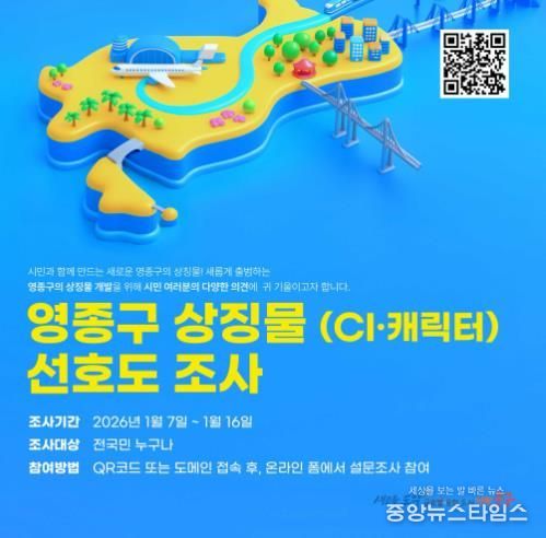 (중앙뉴스타임스 = 방재영 기자) 인천 중구는 올해 7월 출범할 ‘영종구’의 정체성과 지역 이미지를 담은 영종구 상징물(CI, 캐릭터) 선정을 위해 선호도조사를 실시한다고 6일 밝혔다.