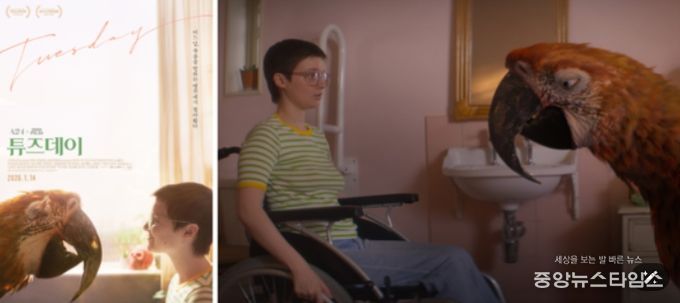 먼저 삶과 죽음에 관한 독특한 시선을 담은 영화 '튜즈데이'는 불치병에 걸린 ‘튜즈데이’와 점점 다가오는 딸의 죽음을 거부하는 엄마 ‘조라’ 앞에 모든 죽어가는 존재의 마지막 순간을 배웅하는 앵무새 ‘죽음’이 나타나며 벌어지는 A24 X BBC FILM의 독특한 휴먼 감동 판타지이다.