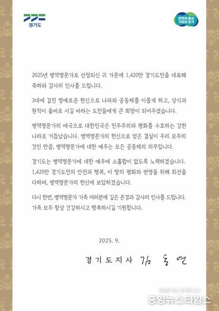 김동연 경기도지사는 서한문을 통해 “병역명문가의 애국으로 대한민국은 민주주의와 평화를 수호하는 강한 나라로 거듭났다”면서 “경기도는 병역명문가에 대한 예우에 소홀함이 없도록 노력하겠으며, 헌신에 보답하겠다”고 감사와 존경의 뜻을 표현했다.